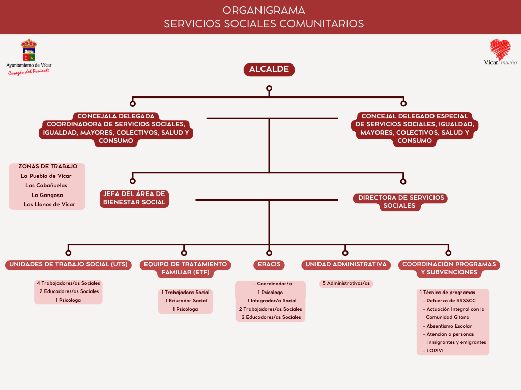 El Centro de Servicios Sociales Comunitarios de Vícar, dependiente de la Concejalía de Bienestar y Familia del Ayuntamiento, tiene como misión atender a todos los ciudadanos del municipio. Su objetivo es facilitar el acceso a recursos, programas y prestaciones que favorezcan el desarrollo personal y social, y prevenir situaciones de exclusión social.