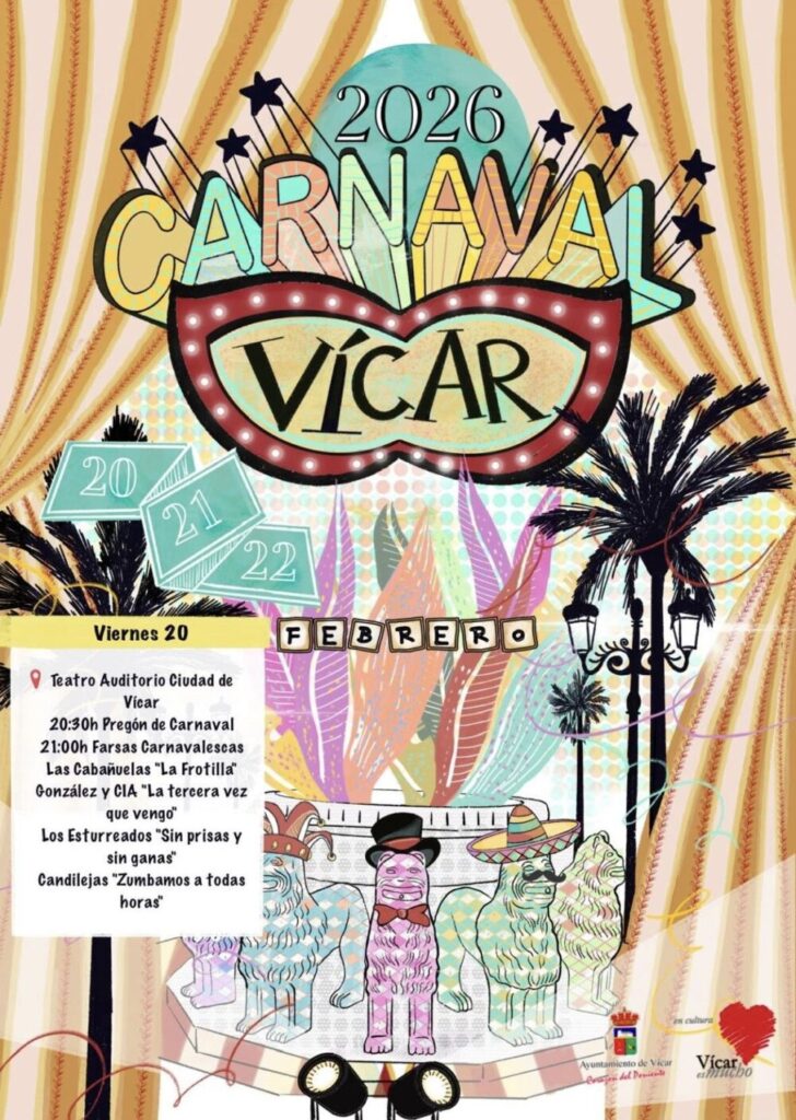 Por su parte, será a partir del viernes cuando comience oficialmente el Carnaval de Vícar 2026 con la lectura del pregón a cargo de Carmen Real Romera. Tras este, que tendrá lugar a las 20.30h en el Teatro Auditorio, dará comienzo el Certamen de Farsas Carnavalescas con la actuación de los grupos: Las Cabañuelas, González y CÍA, Los esturreados y Candilejas. El certamen es uno de los grandes atractivos del Carnaval vicario de tal forma que las entradas para asistir al espectáculo se agotan el mismo día de su puesta a la venta. Así, con el fin de que nadie se pierda la oportunidad de disfrutar de este gran evento cultural, el Ayuntamiento de Vícar retransmitirá en directo el certamen a través de su canal de Youtube.