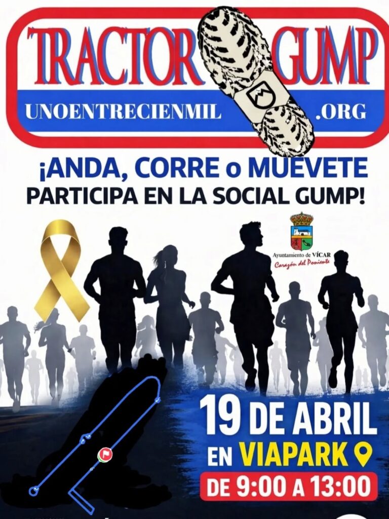 Vícar, 15 de abril de 2026: El corredor vicario Francisco Martín, “Tractorman”, abanderado de la ONG unoentrecienmil.org, sigue adelante con su proyecto solidario y haciendo kilómetros para completar su Reto Tractor Gump, con el que no para de sumar euros que se destinarán a la investigación de la leucemia infantil. En esta ocasión, el corredor ha convocado la primera quedada solidaria ´Social Gump´ que va a tener lugar el próximo domingo día 19 entre las 9.00 y las 13.00 horas en los aparcamientos del Centro Comercial de Vícar Viapark. La cita solidaria consistirá en un recorrido de dos kilómetros alrededor de la zona de aparcamientos, en el que cada participante podrá ir al ritmo que prefiera y dar las vueltas que quiera. Además, pensando quien no quiera o no pueda correr, podrán acudir y disfrutar sin más de un ambiente solidario y familiar.
