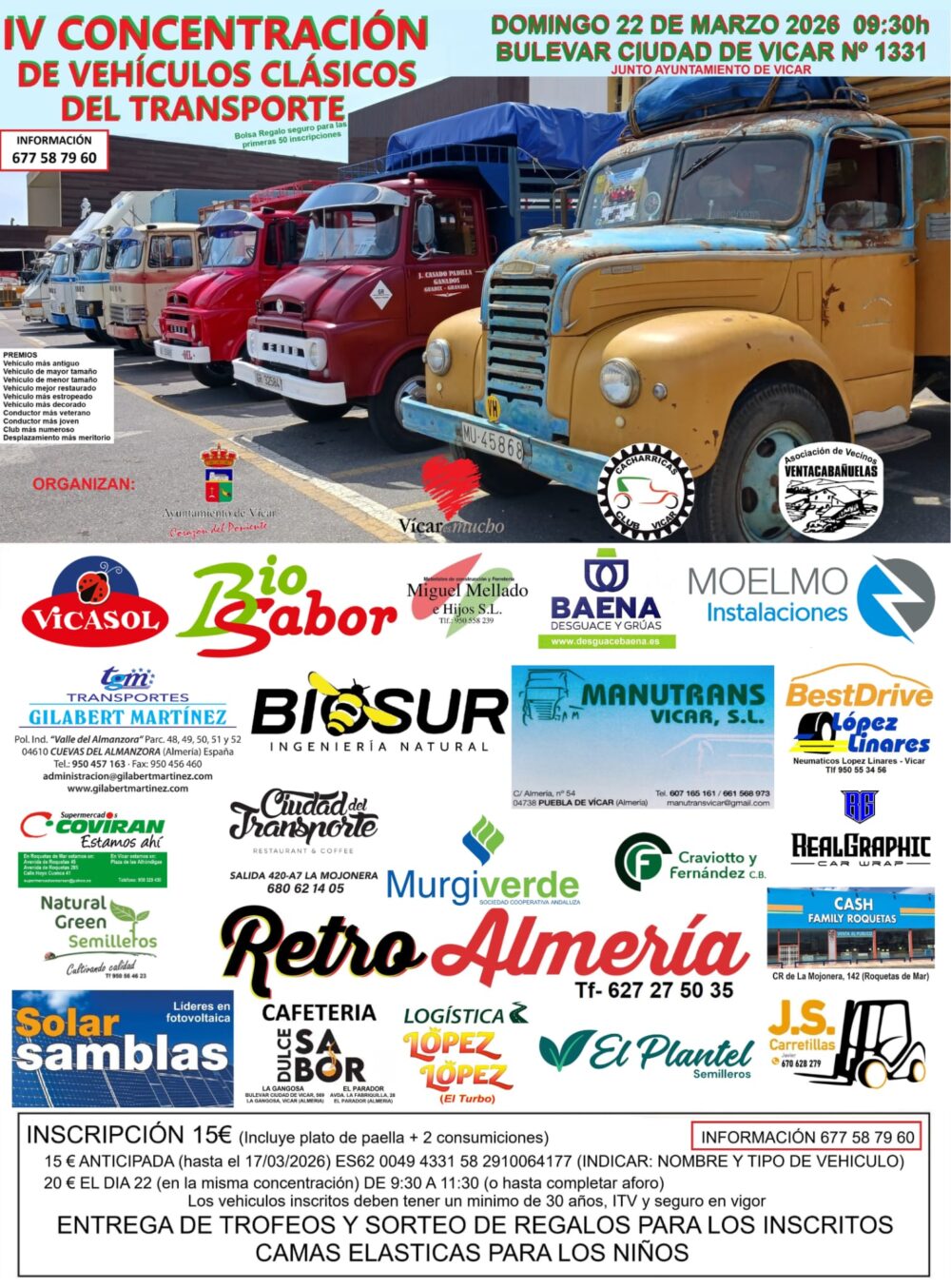 Vícar acoge la IV Concentración de Vehículos Clásicos del Transporte, una jornada para disfrutar de camiones y vehículos históricos en un ambiente familiar. El evento contará con exposición, entrega de trofeos, sorteo de regalos y actividades para niños.