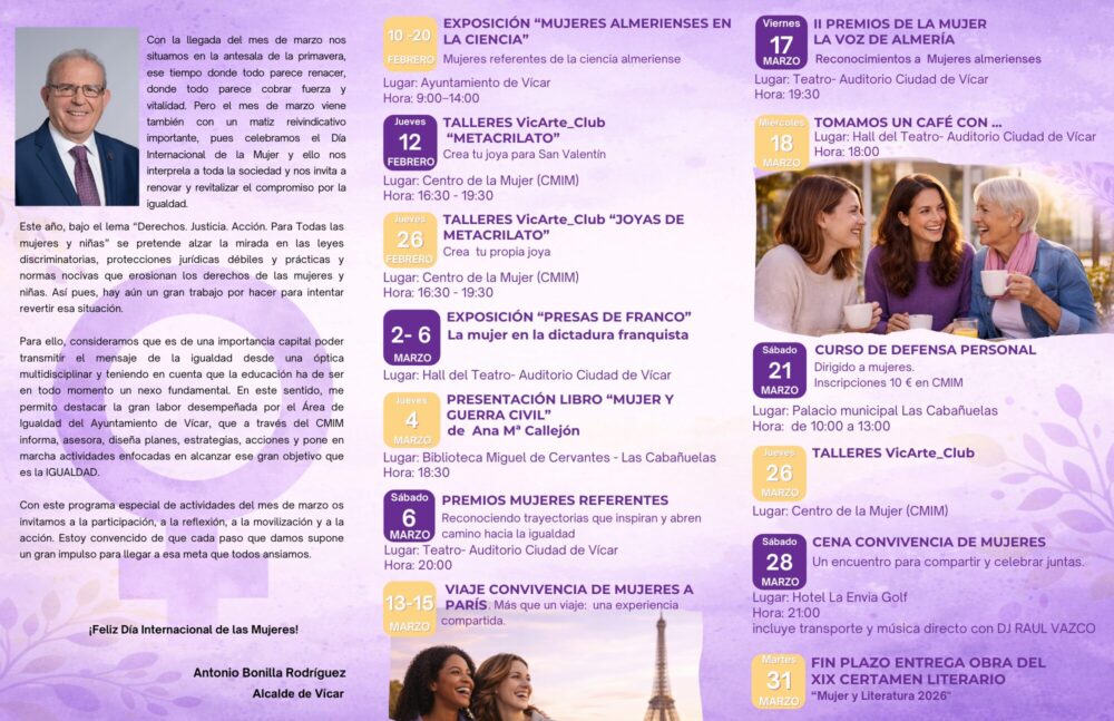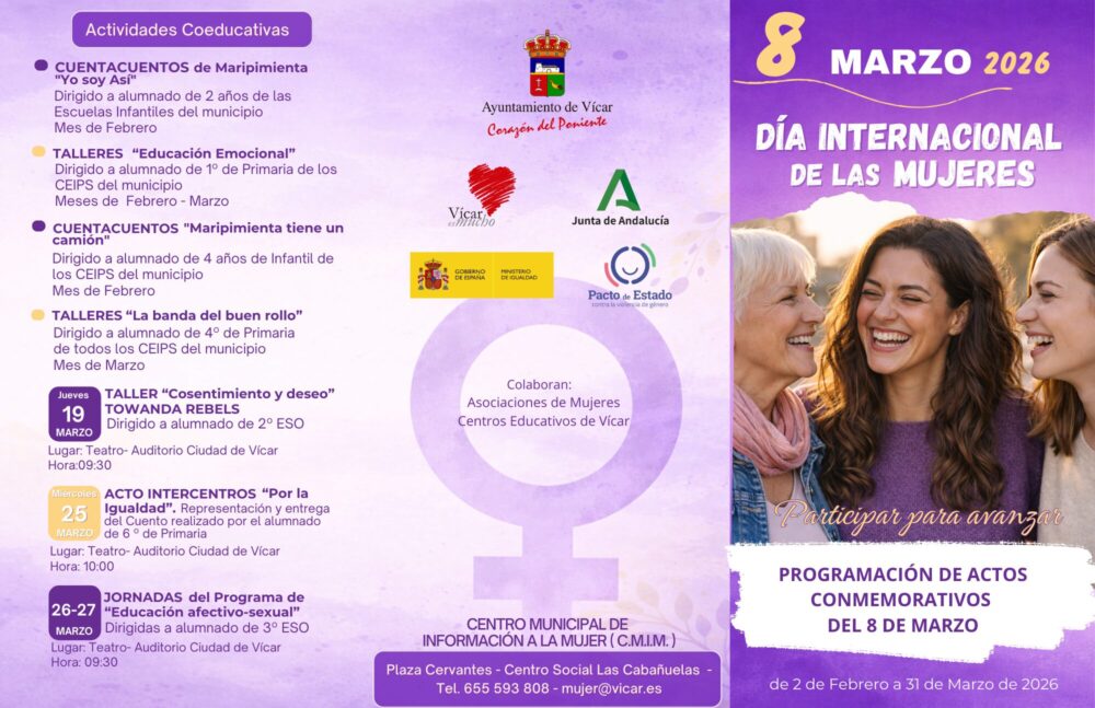 Con motivo del 8 de Marzo, desde el Ayuntamiento de Vícar presentamos una programación especial que se desarrollará del 2 de febrero al 31 de marzo, con propuestas para sensibilizar, reflexionar y avanzar en igualdad.