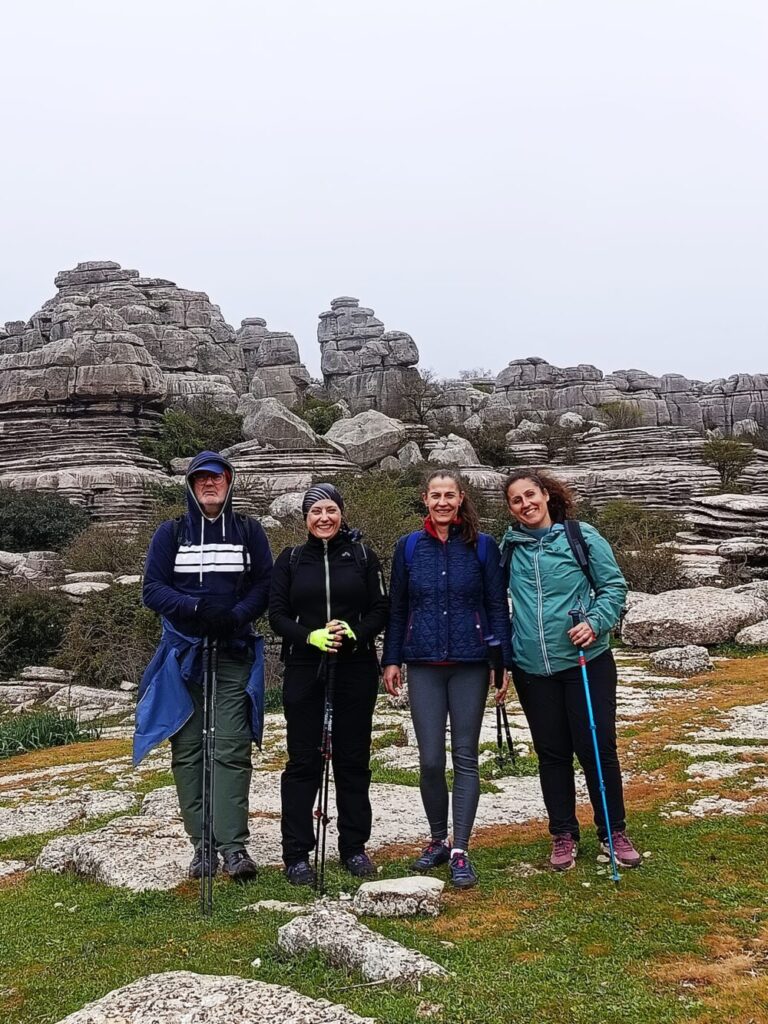 Vícar, 13 de abril de 2026: Los participantes en la penúltima cita senderista de la temporada del programa ‘Deporte y Naturaleza’, organizada por el Area de Deportes del Ayuntamiento de Vícar, disfrutaron ayer domingo de un cómodo recorrido para conocer la belleza natural de la zona alta del Torcal de Antequera, en Málaga, con su famoso paisaje kárstico, lleno de formaciones rocosas caprichosas y senderos estrechos entre intrincados laberintos de piedra. Un escenario natural de singular belleza que, debido a la lluvia y al cielo encapotado ofrecía ayer una apariencia más mágica de lo habitual. Fue una ruta de unos catorce kilómetros, y 200 metros de desnivel en un recorrido lineal de unas cinco horas de duración y dificultad media.