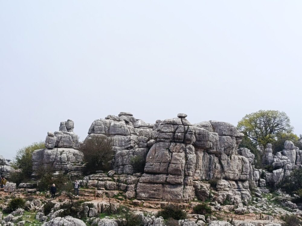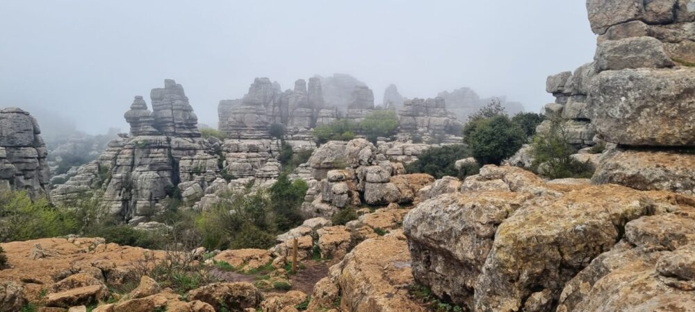 La lluvia brindó a los senderistas vicarios una visión mágica del paisaje kárstico del Torcal de Antequera